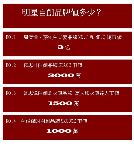 而針對這種明星以自己名義創立品牌的現象,究竟明星們的品牌價值值多少?為此記者特意采訪了知名品牌管理學者的楊教授,據楊教授解釋:由于藝人本身具有較高的社會知名度和形象的度,因此藝人創意品牌的價值起點都會比普通人高出好幾倍,因此藝人的知名度和形象度與其創立的品牌價值是密切相關,從某種意義上成正比關系,而對娛樂圈的一些藝人及其自創品牌,楊教授也給出一個系統的市值評估,如羅志祥的自創品牌STAGE市值 3000萬,林俊杰的自創品牌SMUDGE市值1000萬,曾志偉自創的火鍋品牌烹大師火鍋達人市值1500萬,而周杰倫與蔡依林這次合伙經營的MR.J和MR.Q市值,楊教授也給出了一個值得參考的數據3億。