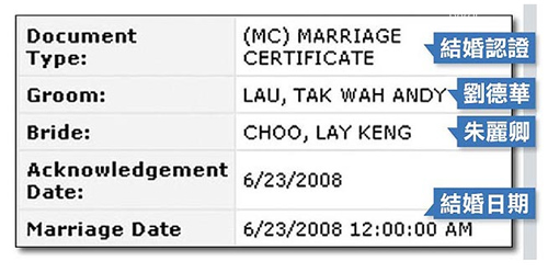 從美國內華達州克拉克郡的公共搜尋網站可以發現一筆數據,疑似就是兩人的結婚證據,或許也是讓華仔留言道歉的關鍵原因。Lau Tak Wah Andy就是劉德華粵語發音的英文名字,而Choo Lay Keng分析就是朱麗倩本名朱麗卿的英文名字。從這份數據可以發現,兩人在去年6月23日,于賭城拉斯韋加斯注冊結婚,至于結婚通知與注冊日期都是同一天,兩人有可能是即興結婚。