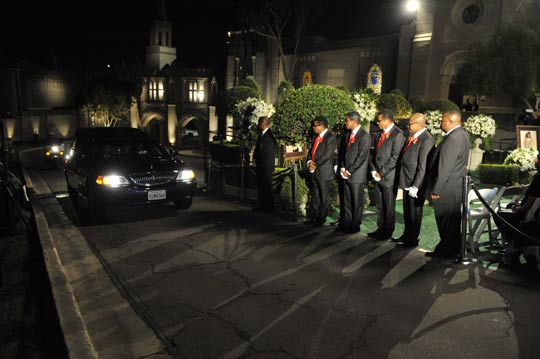 臺灣TVBS消息,白色的鮮花將杰克遜的葬禮布置得莊嚴素雅,棺木旁還有一幅杰克遜的畫像。包括玉婆伊麗莎白.泰勒,還有麥考利.金都紛紛出席,要送杰克遜最后一程,但是杰克遜的家人卻延遲了1個多小時才出現(xiàn),也讓原本要在北京時間10點舉行的葬禮,一直到11點才開始。
