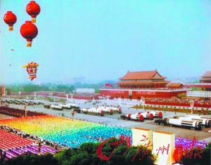 我覺(jué)得自己很是神氣,因?yàn)槲艺驹诘谝慌,手里的花環(huán)是亮麗的紅色。整整一個(gè)暑假,我們?cè)趯W(xué)校的操場(chǎng)、在機(jī)場(chǎng)的停機(jī)坪上、甚至在天安門(mén)廣場(chǎng)演練,走正步喊口號(hào),有節(jié)奏地?fù)]舞花環(huán)。