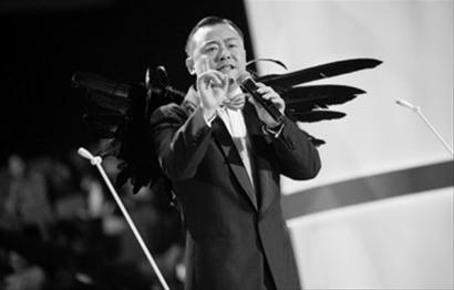 當晚,周立波一身筆挺修身的黑西裝在舞臺上亮相,只不過背后“長”出了一雙黑色的羽毛翅膀,最搞笑的是,他居然提了個小板凳,然后直挺挺地站了上去,因為他周圍的美女個頭都比他高。“我今天的造型其實是個天使,但很多人說我像只烏鴉,但你們別把烏鴉不當鳥,別把饅頭不當點心!”