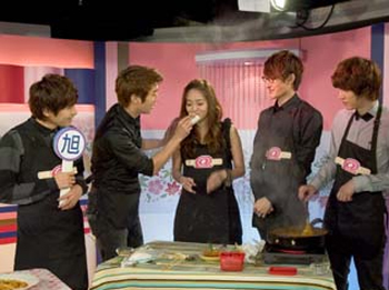 中新網12月31日電 近日,Super Junior-M再度上臺灣娛樂節目,搶著做美食給甜心美女主持侯佩岑。節目中,由厲旭和韓庚分成兩組進行PK,但被分在韓庚組的東海卻包了個巨大水餃,還在里頭狂加辣,嚇得侯佩岑直說,“媽媽們千萬別讓他進廚房啊。”