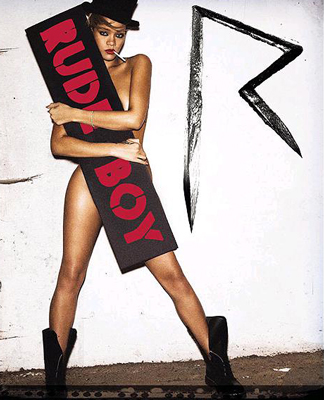“今日新聞”援引英國《太陽報》報導稱,蕾哈娜這次全裸上陣拍攝新專輯封面,手中僅抱著一塊寫著牙買加流氓rude boy的告示牌遮住三點,嘴上叼著一根香煙,腳上則采著一雙男用軍靴,展現她叛逆反骨的個性。