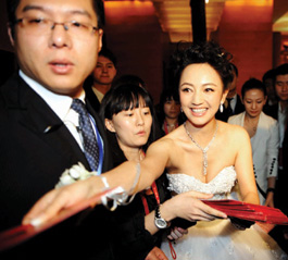 天后王菲的駕到,使得這場婚禮頗具轟動效應,也許是王菲的星光太過耀眼,以至于隨后新郎和新娘、伴郎張楊、伴娘薛佳凝的露面都有些暗淡。