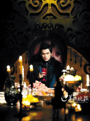 在新專輯預(yù)售海報(bào)上,周杰倫以一個(gè)中古世紀(jì)的吸血鬼扮相出現(xiàn)。只見他臉色蒼白,嘴唇鮮紅,穿一身西裝外套,還罩了一件羽毛披肩,坐在餐桌前若有所思,像是一個(gè)住在城堡中的神秘“吸血鬼王子”。造型師還在周杰倫的指甲貼上帶有鉚釘?shù)闹讣灼屛罩票氖至髀冻鋈A麗感;眼睛里則戴上了特殊的隱形眼鏡,營造出一雙“電眼”,眼里還有動物般的直立橢圓瞳孔,詭異得令人戰(zhàn)栗。