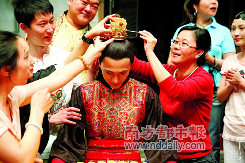 李少紅執導的新版《紅樓夢》歷經一年三個半月的緊張拍攝,終于在昨日殺青!皩氂瘛睏钛笠苍谶@一天迎來了自己的18歲成年生日。昨日,劇組殺青之日,導演李少紅與近百名演職人員一起,為“成年寶玉”楊洋舉行了熱鬧的成人禮。李少紅親手為楊洋摘下通靈寶玉,象征劇組正式殺青;隨后,李少紅又為楊洋戴上金冠,取意“加冠成人”(左圖)。楊洋感動得語帶哽咽:“18歲生日在劇組度過,我覺得很有意義。它對劇組的拍攝工作是一個圓滿的終點,但對于我個人來說,卻是人生新的起點!