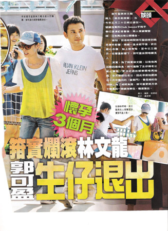 據(jù)昨日香港雜志報道,郭可盈與林文龍今年卷入“桃色勒索案”,5月30日,他們手牽手舉行澄清記者會后,郭可盈的情緒一直未能平復,終日提心吊膽。為了讓林文龍“老實”,之前一直不愿意生孩子的郭可盈終于懷孕,目前,她已有三個月身孕,林文龍終于收心。為了全天候看著老公,郭可盈下決心退出娛樂圈,因此下個月將播出的《富貴門》會是她的告別作。為了減輕負擔,郭可盈將月供十幾萬元的房子快速售出。