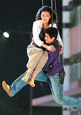 為了吊鋼絲的驚險戲碼,電影公司貼心為城城、舒淇安排替身,但2人大部分仍敬業親自上陣,為求安全,拍攝前都戴上護具做好安全措施,并試戲2、3次才正式開拍,過程大都安全順利。