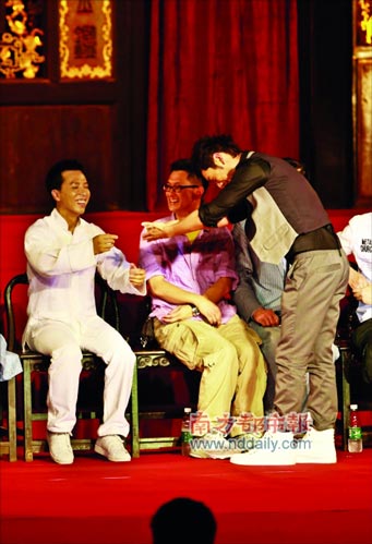 甄子丹當日以一身白色功夫裝亮相,在隨后的發布會,眾多媒體見證了他一次收下黃曉明、釋小龍和蔣岱言三位徒弟!昂_x”出來的“小李小龍”蔣岱言現場耍雙截棍,還虎虎生威地打了一套拳。之后,黃曉明等三人一起向甄子丹敬茶致禮,場面十分溫馨。黃曉明說自己今后將多拍“打戲”,但有記者問:“你怎么一把年紀了才來學武術?”黃曉明笑言:“活到老學到老啦。男人應該都會點功夫,有強壯的體魄,才能保護女人!”