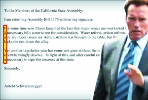 湯姆·阿米阿諾與幾位議員提出了一項(xiàng)法案,希望加州能在舊金山地區(qū)創(chuàng)建基礎(chǔ)設(shè)施融資區(qū),采取融資計(jì)劃推動(dòng)這些地區(qū)的基礎(chǔ)設(shè)施建設(shè)。通常此類(lèi)法案如果不是問(wèn)題太多的話(huà),州長(zhǎng)會(huì)予以批準(zhǔn)。但湯姆·阿米阿諾與施瓦辛格素來(lái)看不對(duì)眼,本月初又在集會(huì)上批評(píng)施瓦辛格的施政方式,還大罵他是“騙子”。施瓦辛格否決了這項(xiàng)提案,并在否決信上以藏頭詩(shī)的形式對(duì)阿米阿諾議員予以反擊,即信件每行第一個(gè)字母連起來(lái)就是“T(Tom),I f k you,A(Arnold Schwarzenegger)”。州長(zhǎng)辦公室新聞發(fā)言人稱(chēng)此事純屬巧合,“試想每天寫(xiě)那么多否決信,這種巧合的出現(xiàn)是遲早的事。”