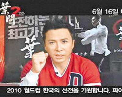臺灣《中國時報》消息稱,《葉問2》遠征韓國,甄子丹正在拍《關云長》無法前往,因此錄了約2分鐘的短片向韓國觀眾問好。他以韓文打招呼,接著說:“韓國是亞洲足球強國,希望韓國隊在本屆世界杯有優秀表現!彼說自己是曼聯隊韓國選手樸智星的球迷。
