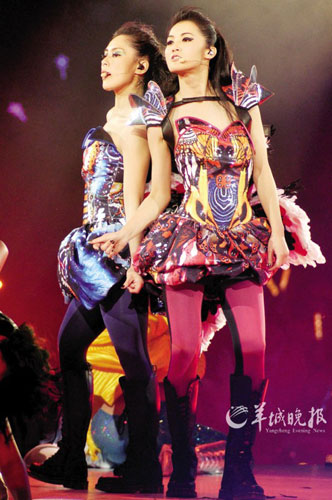 前晚的演唱會場面相當(dāng)華麗,TWINS一共換了五套華服,每套都以不同的主題場景配襯,絕對凸顯“女人味”。一開場,兩人以“冰雪女王”的科幻裝束亮相,取“破冰重出”之意;接著是“小蜜蜂”昆蟲造型,寓意“辛勤勞作望有所獲”;然后是“絢麗大花”小短裙,顯示兩人如花般“美麗綻放”;還有“芭比娃娃”俏麗打扮,取意“依然經(jīng)典可愛”;第五套服裝是夸張“鹿角”配黑白短裙,在《下一站天后》的歌聲中再次展開對“天后夢”的追逐……直到返場時,她們才換回樸素的灰色短裙,裙子上印著她們此次演唱會各自的造型,似乎又回到了現(xiàn)實(shí)。