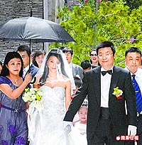 昨早9時(shí)男方以6輛奔馳車隊(duì)至女方家迎娶,親友幫新娘撐的卻是黑傘,依民間習(xí)俗,一般新娘出嫁時(shí),親友會(huì)以米篩遮陽,如果是撐黑傘,多半意味新娘腹中有喜。問新人是否有喜時(shí),他們只說“謝謝”,未正面回答。證婚人鳳凰衛(wèi)視主席劉長(zhǎng)樂入場(chǎng)時(shí),被媒體問:“小孩是男的?女的?”他也未作答。