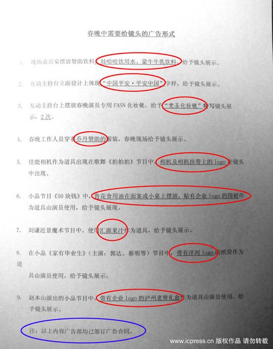 近日網(wǎng)絡上曝光的一張題為“春晚中需要給鏡頭的廣告形式”清單上共列出九條廣告植入條目,包括飲用水、化妝鏡、服飾、相機、酒等,外界十分關(guān)注的劉謙魔術(shù)、趙本山小品《捐助》、郭達蔡明的小品都有涉及。