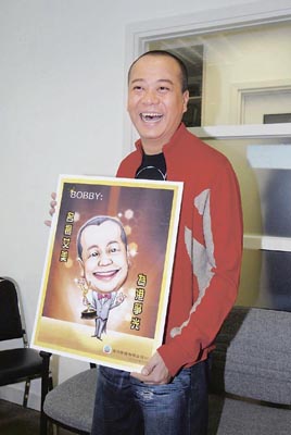 中新網11月14日電 歐陽震華(Bobby)憑劇集《賭場風云》入選“第35屆國際艾美獎”最佳男主角5強,無線為隆重其事,昨日特別安排制作資源部副總監樂易玲陪同Bobby于電視城舉行記者會,更即場送上一幅寫上“名揚艾美·為港爭光”的Bobby得獎畫板示鼓勵。