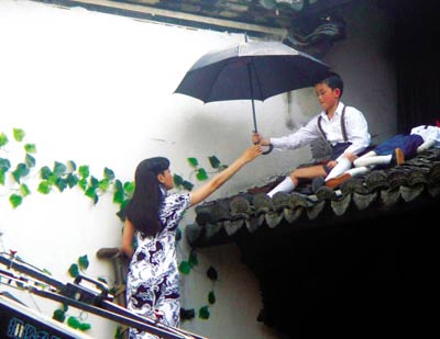 昨日的一場戲,是秦嵐和劇中的兒子吳磊拍對手戲。由于天氣炎熱,秦嵐說雖有洋傘遮陽,但妝還是化得很快。小演員吳磊當(dāng)天很是不適,拍到最后竟然中暑,又吐又哭,忙壞了劇組的工作人員。按照劇情,秦嵐要從屋頂上往下跳,盡管劇組為她請了替身,但為了追求真實和進度,秦嵐親自上陣,從數(shù)米高的地方往下跳,這場戲總算結(jié)束。
