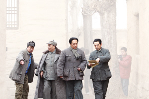 連續兩天下雪,懷柔影視基地也一片銀裝素裹。記者進入拍攝現場時,工作人員一再叮囑,一定要跺跺腳再進去,免得在剛剛打掃好的通道上再踩上雪。而這個通道,就是片中毛澤東、周恩來、朱德等眾多人物步入七屆二中全會會場的通道。