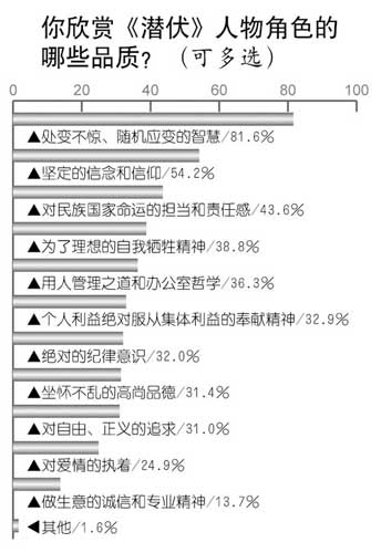 觀眾欣賞《潛伏》中人物的哪些品質?調查中81.6%的人首推“處變不驚、隨機應變的智慧”,54.2%的人選擇“堅定的信念和信仰”,43.6%的人選擇了“對民族國家命運的擔當和責任感”,接下來依次為:“為了理想的自我犧牲精神”(38.8%),“用人管理之道和辦公室哲學”(36.3%),“個人利益絕對服從集體利益的奉獻精神”(32.9%),“絕對的紀律意識”(32.0%),“坐懷不亂的高尚品德”(31.4%),“對自由、正義的追求”(31.0%),“對愛情的執著”(24.9%),“做生意的誠信和專業精神”(13.7%)。