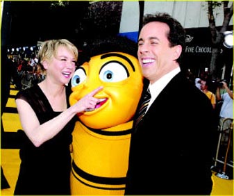 10月28日晚,洛杉磯西木區的曼恩鄉村劇院成為“蜜蜂”的世界,一輛輛漆成黃底黑條的甲殼蟲汽車停在劇院外,走下車的是好萊塢女星蕾妮•齊薇格和喜劇明星杰瑞•宋飛,在同樣黃黑相間的地毯另一端,一只巨型大蜜蜂卡通玩偶早已恭候多時,動畫新片《蜜蜂總動員》首映就這樣熱鬧登場了。
