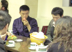 王寶強在旁邊的椅子上坐著,而之后,服務員把一個果盤端到桌子上,幾個演員也全部坐了下來,王寶強還是不吭聲,默默地拿起牙簽吃水果,馮鞏和閻學晶則在交流本子,偶爾馮鞏會交代王寶強幾句,王寶強就顧著點頭,然后繼續(xù)吃。