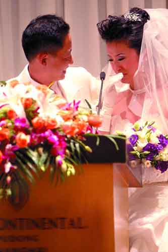 下午6點,婚禮正式開始。據(jù)現(xiàn)場記者透露,王志文和陳堅紅穿著西服和婚紗踏上了紅毯,在婚禮進行曲中走上舞臺。著名導(dǎo)演田壯壯擔(dān)當(dāng)證婚人,當(dāng)王志文深情地對著新娘陳堅紅說:“很愛你!”時,陳堅紅不禁淚灑現(xiàn)場,兩人深情舉起香檳,喝了交杯酒。整個儀式只舉行了15分鐘,很簡單,但是很溫馨,現(xiàn)場一位賓客說:“我們都能感受到王志文對陳堅紅的愛。”