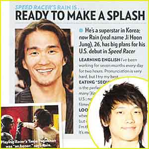 美國演員卡爾·楊最近是春風(fēng)得意,剛剛主演了沃卓斯基導(dǎo)演的《極速賽車手》不說,還“錯誤地”登上了美國著名的《人物》雜志。《人物》雜志的編輯把卡爾·楊誤認(rèn)為是韓國明星Rain,在照片邊上還配了一段文字:“他在韓國是鼎鼎大名的超級巨星,本名叫鄭智熏,粉絲們都稱他‘Rain’,《極速賽車手》是他投身好萊塢的第一步。” 微特