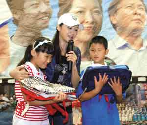 著名影視明星曹穎前天來到南京參加兒童電影《同一片藍(lán)天》的首映式,這部電影著重反映外來工子弟學(xué)生精神風(fēng)貌。即日起將向全國中小學(xué)生公益放映。圖為曹穎在首映式上向從四川受災(zāi)地區(qū)來寧讀書的王天幸、馬瑩雪轉(zhuǎn)贈(zèng)學(xué)習(xí)用具。安福 婉愉 攝