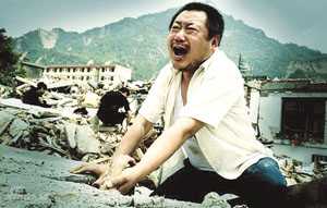 劇照中,范偉拉著“家人”的手哭喊。他表示,自己沖上那片廢墟以后一下就不能自拔了,然后在拼命刨廢墟,很快手就被磨爛了,但他自己當時根本沒有感覺。