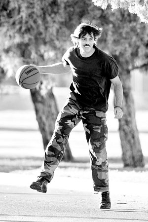 北京時(shí)間今天凌晨,驚悚片《以眼殺人》拍攝間隙,幾名工作人員在離片場(chǎng)不遠(yuǎn)的一個(gè)球場(chǎng)上練習(xí)投籃。穿著迷彩服、軍靴,戴著假發(fā)(他在片中飾演一名秘密特工)的克魯尼也聞聲而至。“嗨,伙計(jì)們,讓我來(lái)一個(gè)!”