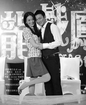 在《游龍戲鳳》中,劉德華飾演城中富豪,舒淇變身賭場發牌員,兩人演繹了一段浪漫情緣。這也是他們繼劉偉強的《衛斯理之藍血人》后再度攜手,只不過,《藍血人》中兩人毫無感情瓜葛,但在《游龍戲鳳》中卻是專門談情說愛。昨日劉德華的右手無名指上戴著一枚戒指,和舒淇左手上的明顯是一對。對此,華仔解釋說戒指“只是片中道具”。娛樂記者們不肯輕易放過他,有人大聲問:“如果舒淇嫁給你,你會答應嗎?”劉德華隨即把難題拋給了舒淇:“你不知道嗎?我向她求過兩次婚呢,可都被拒絕了!辈贿^舒淇卻眼含深情地表白道:“其實他是我們所有女人心目中最好的男人!