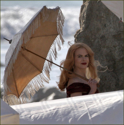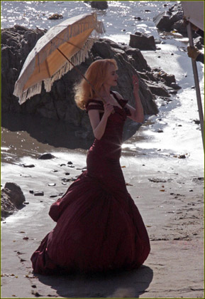 妮可·基德曼2月19日在洛杉磯的某海灘上為某雜志拍攝宣傳寫真,當(dāng)天的妮可·基德曼化身中世紀(jì)的貴婦,穿著暗紅色的絕美長(zhǎng)裙,襯得身材玲瓏,肌膚透白,手中的陽(yáng)傘更是增添了高貴優(yōu)雅,和妮可·基德曼得天獨(dú)厚的氣質(zhì)完全符合。