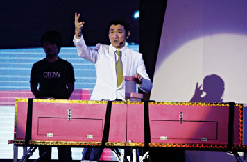 劉謙變魔術,那是他的老本行,而劉德華就純粹是客串了,但在舞臺上的一招一式,劉德華倒并不業余。第一個魔術請出了他的“女朋友 ”:“她是我今天的女朋友哦!边呎f邊摸著美女的手,“為了公平起見,我要邀請媒體朋友一起來參與。”“還有你,美女,我喜歡漂亮的……”還沒開始變魔術,之前的噱頭已擺得夠足!皩⒚琅P在盒子里,用鋒利的刀等工具往下插,然后盒子分離,人也就此被分尸……”表演內容并不陌生,但出自華仔之手,粉絲們看得津津有味,尖叫聲不斷!華仔究竟用了多少時間學會變這個魔術的呢?“這個是秘密,不能告訴你們!惫首魃衩氐娜A仔透露說,自己曾經上過劉謙的節目,也跟他學了幾招。