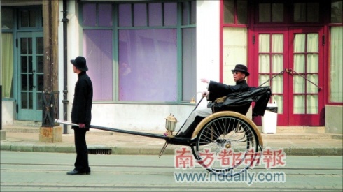 前天,《建國(guó)大業(yè)》的拍攝場(chǎng)地就在車墩影視基地的“南京路”,既然拍的是上海戲,當(dāng)時(shí)上海灘的大佬杜月笙就自然成了重要人物。昨天,馮小剛的“任務(wù)”就是坐在黃包車上,后面跟著一幫人馬,在“南京路”上拉風(fēng)地走過去。馮小剛戴著帽子,鼻梁上架著圓圓的老式墨鏡,拎著一個(gè)拐棍,他的黃包車,也被做成了鍍金的。黃包車后面,跟著20多個(gè)黑衣保鏢,派頭十足。這個(gè)造型,讓人不免想起了《功夫》中馮小剛客串的鱷魚幫老大。