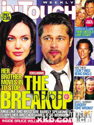 布拉德·皮特和安吉麗娜·朱莉的夢幻愛情,似乎有幻滅的趨勢。最近,不止一家的美國雜志報道了兩人的感情危機。就連臺灣媒體也不甘示弱,報道中稱布拉德·皮特、安吉麗娜·朱莉關系陷入冰點,兩人協議暫時分居。假如情勢無法挽回,小布將爭取六名子女的監護權,另外,高達2億美元的財產分配問題,恐怕也會讓這對“史密斯夫婦”展開廝殺。