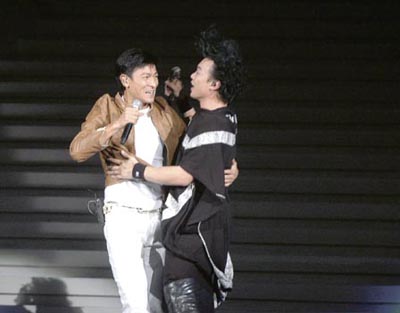 有好友捧場(chǎng),Eason全程落力演出,華仔于11時(shí)從觀眾席上臺(tái),引得全場(chǎng)觀眾尖叫不停。華仔與Eason首先合唱《我恨我癡心》,其間3度擁抱,又互跪又鞠躬,情緒極度高漲。