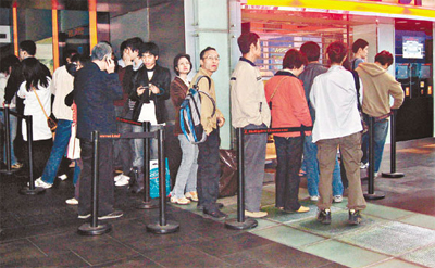 至于另一邊圓方的售票站,因信用卡付款出問題只能收現金,令賣票進度大阻,單排頭位買票便花了近一小時,其他輪候歌迷要急急往銀行提款,以免耽誤事。對于售票機制,學友經理人陳淑芬說:“因為不在紅館搞,所以就沒有限制了!”提到信用卡機失靈,她說:“不關這部機的事,是電話線出問題,后來也就沒事了!”