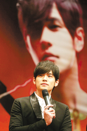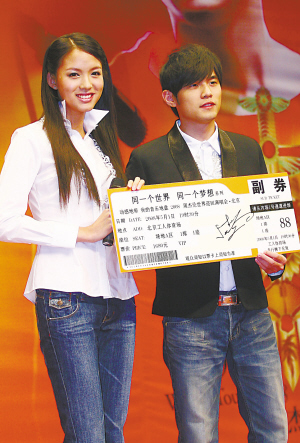 周杰倫在現(xiàn)場把首張VIP門票送給了新晉世界小姐張梓琳。記者 郭延冰 攝