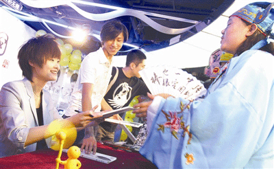 。犗挛2時(shí),李宇春準(zhǔn)時(shí)開(kāi)始簽售,此時(shí)場(chǎng)外已經(jīng)被“玉米們”圍得水泄不通。李宇春在連續(xù)兩個(gè)多小時(shí)的簽售中始終保持微笑,并堅(jiān)持親手遞過(guò)簽名本,對(duì)每一位歌迷說(shuō)“謝謝”。因?yàn)槔钣畲簩]嬛杏惺住缎悴藕,昨天?位“玉米”專門(mén)穿著古裝扮成“秀才”前來(lái)捧場(chǎng),她們用折扇遮住自己的臉龐,集體一亮相便引得李宇春哈哈大笑。
