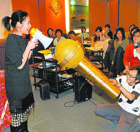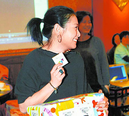 歌迷送劉若英(左)巨型麥克風,希望她繼續(xù)唱歌。
