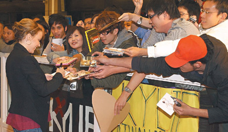 中新網12月3日電 澳洲女歌手凱莉·米洛昨天傍晚抵臺,為明晚在中山足球場登場的演唱會準備,雖貴為天后,但凱莉態度親和,帶著招牌笑容為歌迷簽名,表現出亞洲巡回終站的好心情。