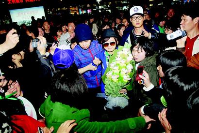 在歌聲與口號(hào)聲中,頭戴小禮帽、以乖乖學(xué)生模樣打扮的周筆暢亮相了,剎那間,筆親們的聲浪掀翻候機(jī)大廳,鮮花、閃光燈,一股腦兒涌向她,倒讓半年未公開(kāi)露面的周筆暢有些局促,紅著臉揮著手,靦腆地環(huán)顧擁擠的人群。