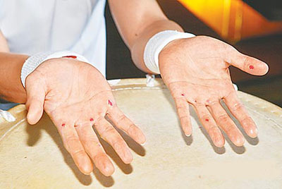 中新網(wǎng)3月24日電 吳尊上月底在香港紅館的“飛輪海”演唱會(huì)中,因吊鋼絲時(shí)發(fā)生意外,左腳板的左側(cè)骨出現(xiàn)1道裂痕,不能跳舞的他昨特別為本周六的馬來(lái)西亞演唱會(huì)排練打戰(zhàn)鼓,結(jié)果他為練鼓而導(dǎo)致雙手多達(dá)11處破皮傷口,他苦笑說(shuō):“我的腰也因使力不當(dāng)而肌肉拉傷。”