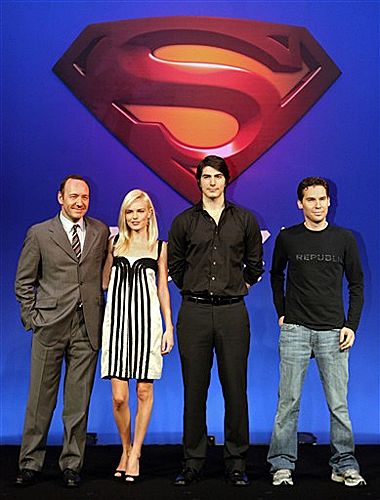 8月1日,電影“超人歸來(lái)”在日本東京做宣傳。圖為劇中演員凱文·斯帕西(左一)、 凱特·伯斯沃斯(左二)、布蘭登·羅斯(右二),以及導(dǎo)演布萊恩·辛格(右一)。(法新社圖)