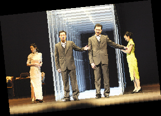 如果你中途進(jìn)場,舞臺上8個人走來走去可能會讓你有點摸不著頭腦。穿著一樣的西裝背心和西褲的兩個振保,辛柏青代表世俗的、不得不扮給社會看的表象的振保,而高虎則代表內(nèi)心的那個不時想出軌、不時與自己斗爭的內(nèi)心的振保。而紅玫瑰和白玫瑰也都有兩個,同樣一個是內(nèi)心想做的、一個是表象必須做的:你可以看到秦海璐飾演的紅玫瑰在與振保調(diào)情,而舞臺后方另一個與她同樣打扮的紅玫瑰還在與丈夫王士洪悠閑地聽著唱片;你可以看到胡靖釩飾演的白玫瑰在囑咐丈夫振保“出門記得帶傘”,而在她身后另一個白玫瑰正在與小裁縫曖昧地聊天……一開始還真有點不適應(yīng),可看進(jìn)去卻覺得這種形式非常新奇有趣。經(jīng)常是,2個振保、4朵玫瑰,加上王士洪和小裁縫8個人一起出現(xiàn)在舞臺上,一起說話、一起行動,奇怪的是,作為觀眾的你并不覺得混亂。舞臺形式也很有趣,舞臺中央一道玻璃通道,2個振保一同從幕后走進(jìn)通道,然后分別打開通道兩側(cè)的門,一個走進(jìn)現(xiàn)實生活中與白玫瑰的家,另一個走進(jìn)另一側(cè)與紅玫瑰的回憶。