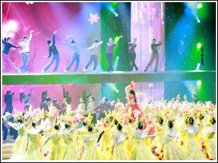 歌舞類節(jié)目時(shí)長為1小時(shí),記者粗略計(jì)算,僅上半場的歌舞類節(jié)目就占了近50分鐘。開場舞《飛向春天》由185位女舞者共同完成,她們不斷變換隊(duì)形,時(shí)而如花潮涌動(dòng),時(shí)而像火山噴發(fā),熱鬧而奢華;舞蹈《飛天》題材獨(dú)特,7位女孩宛若傳說中的七仙女,舞步婀娜多姿。歌曲方面,費(fèi)玉清有幸獨(dú)唱《千里之外》,其他歌曲則多以串燒形式登臺(tái),龐龍的《啷咯情歌》、鳳凰傳奇的《月亮之上》、黃圣依的《天天向上》、胡楊林的《香水醉》、張瀾瀾的《一家人》、郭美美的《不怕不怕》分別占據(jù)流行板塊和新人板塊。