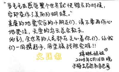 中新網5月21日電 四川發生巨變,現正以世界小姐身份到全球各地訪問的張梓琳,發布一份由她親筆寫下的鼓勵災區小朋友的信件,并急切希望能早日回國參與及幫助災區的活動。
