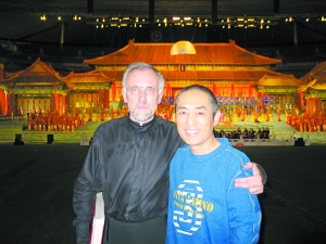 張藝謀版歌劇《圖蘭朵》在巴黎公演前,張藝謀(右)與世界著名指揮大師雅諾什·阿克斯在演出舞臺前合影。