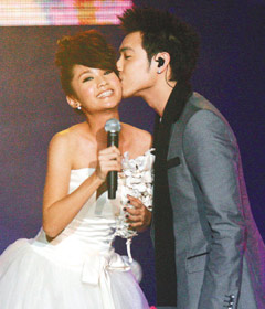 中新網(wǎng)12月22日電 偶像劇“不良笑花”風(fēng)光下檔,楊丞琳昨晚在慶功演唱會披婚紗,化身劇中角色“蔣小花”,和屏幕情侶潘瑋柏合唱“今天你要嫁給我”,潘帥主動求婚、作勢獻吻,現(xiàn)場上千位歌迷作見證,鼓噪兩人“親下去”、“舌吻”,無奈楊丞琳不領(lǐng)情,害羞撇過頭去。