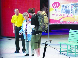 情節:北京奧運會期間,蔡明十分羨慕志愿者。她遇見了穿著志愿者服的郭達,于是纏著他,要跟他一起幫助來北京的客人。兩人遇見了急著找廁所的韓國小伙子,因為聽不懂小伙子說啥,折騰了半天才明白過來,直把小伙子急得捂著小腹,滿地亂跳。接著兩人遇見了迷路的美國小伙子。美國小伙子只會說簡單的中文,郭達只會說Welcome to beijing這么一句外語,于是又是一陣瞎鬧騰。蔡明指手畫腳,希望用肢體語言讓小伙子明白各種地名,但越搞越亂。此時,真正的志愿者上場,原來郭達只是穿了人家晾在外面的志愿者服。蔡明、郭達失落之時,遇見走失了新郎的新娘,兩人想盡辦法幫她找到了新郎,十分高興,最后大家邊為觀眾發喜糖邊退場,喜氣十足。