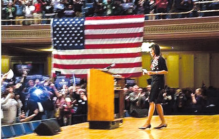 在coolspotters網站查詢“米歇爾·奧巴馬”,就會出現大量關于米歇爾服飾的網頁,其中一個頁面是在奧巴馬總統就職期間,米歇爾參加一個演講活動時的畫面。畫面上的米歇爾腳穿BandolinoBerry一款黑色鞋子,搭配著JCrew的套裝。